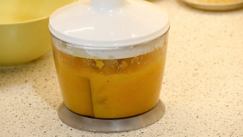 А в это время займёмся начинкой. Один апельсин режем кубиками прямо с кожурой (можно не очень мелко), попутно удаляя косточки, и складываем в чашу блендера.