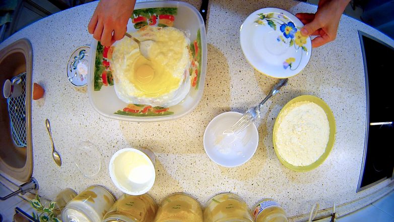 … добавляем к нему 80 грамм сахара и растираем их вместе.