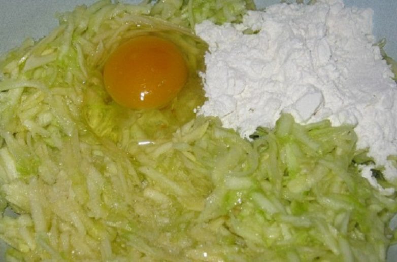 Соедини кабачок, яйцо, манку, муку, соль и перец в небольшой емкости.