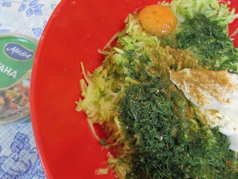 В удобной емкости соедини кабачки, укроп и сметану. Добавь яйца и соду. Хорошо всё перемешай.