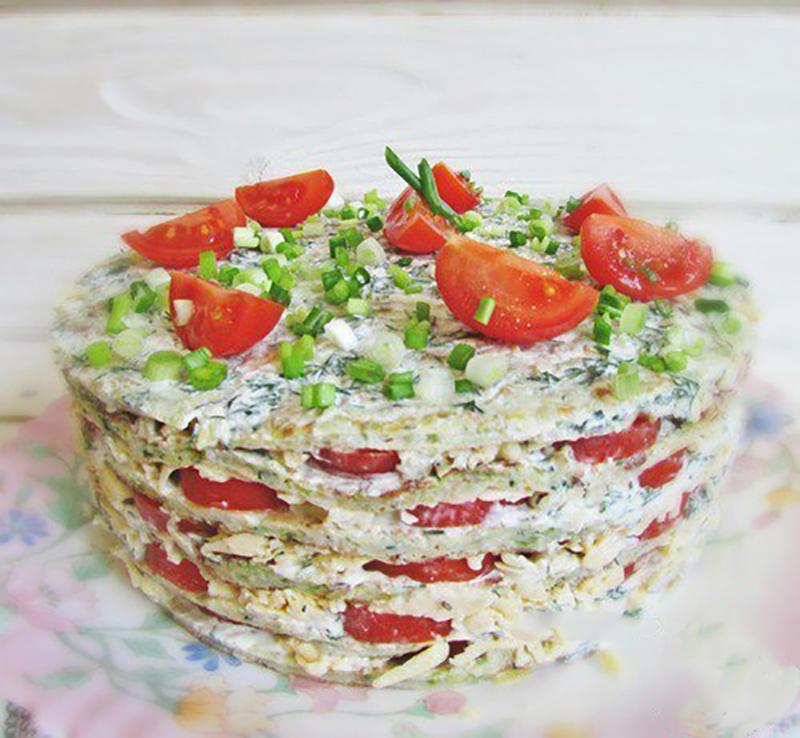 Готовый торт можно украсить зеленым луком и помидорами-черри.