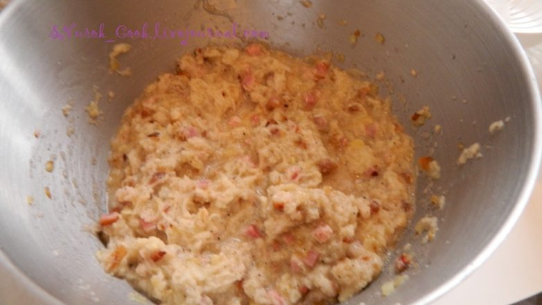 Картошку мелко натереть. Я пользуюсь комбайном.