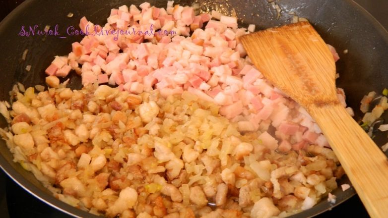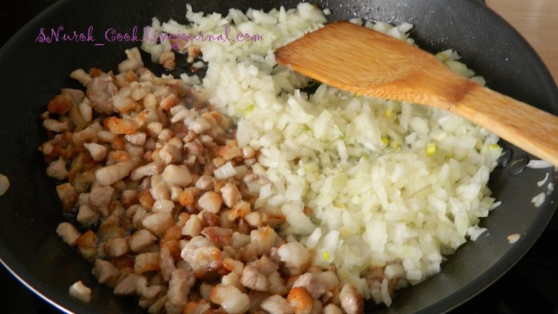 После того, как лук обжарится, добавить копченое сало и все вместе еще немного обжарить