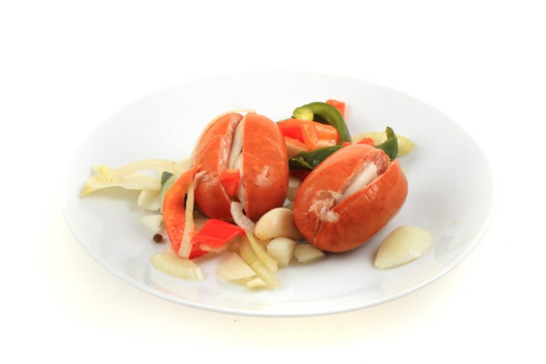 Со шпикачек снимаем оболочку, делаем продольный надрез примерно на 2/3 глубины. Со всех сторон посыпаем черным и душистым перцем. Внутрь шпикачки (в разрез) кладем полоску острого перца и чеснок. Также можно положить полоску маринованного огурчика.