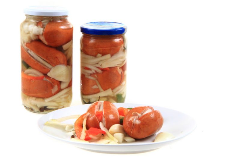 Лук режем как для шашлыка. В банку укладываем слоями – лук, шпикачки, лук, шпикачки. Лук не жалеем. Уложив все в банку, заливаем доверху маринадом и сверху закрываем еще луком. Банку можно закрыть крышкой или пищевой пленкой. Ставим в темное прохладное место и ждем 10 дней!На 10-ый день покупаем хорошее пиво и… приятного аппетита!