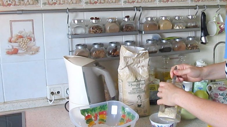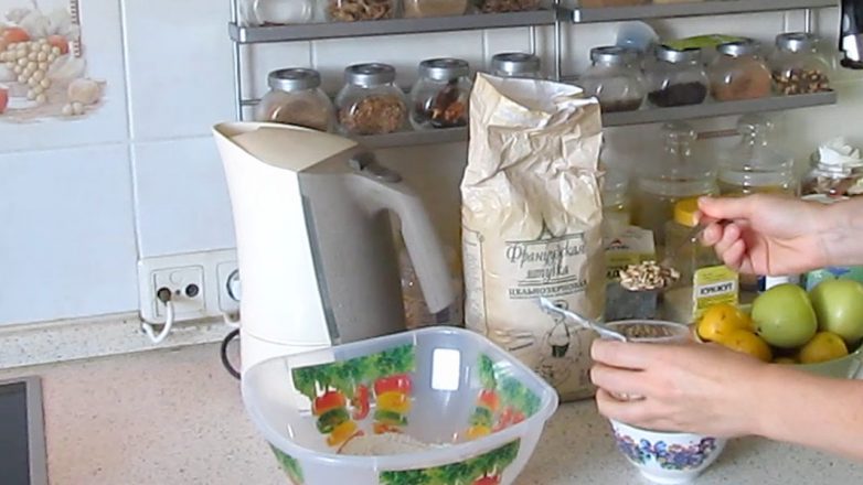 Делаем смесь зёрен (можно в отдельной миске, а можно сразу добавлять к муке). 1,5 столовых ложки семечек…
