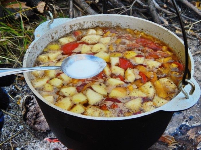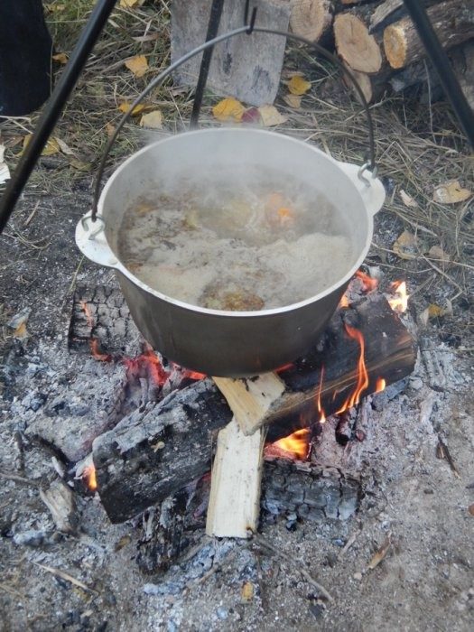Костер дальше нужно «запрограммировать» так, чтобы бульон едва кипел, исключая сильное бульканье. Время от времени снимаем пенку.