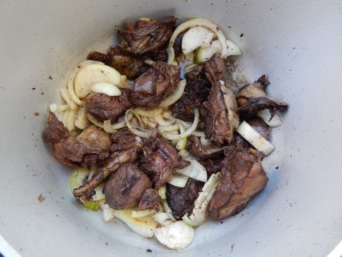 Необходимо следить, чтобы дичь не пригорела, но приобрела золотистую корочку. Периодически помешиваем в течение 20-25 мин. В этот момент я слегка подсаливаю мясо. Здесь подсказка – для дальнейшего нам понадобиться 4 литра кипятка, поэтому ставим рядом котелок с водой. В котелке отражается осенний лес – что может быть лучше!