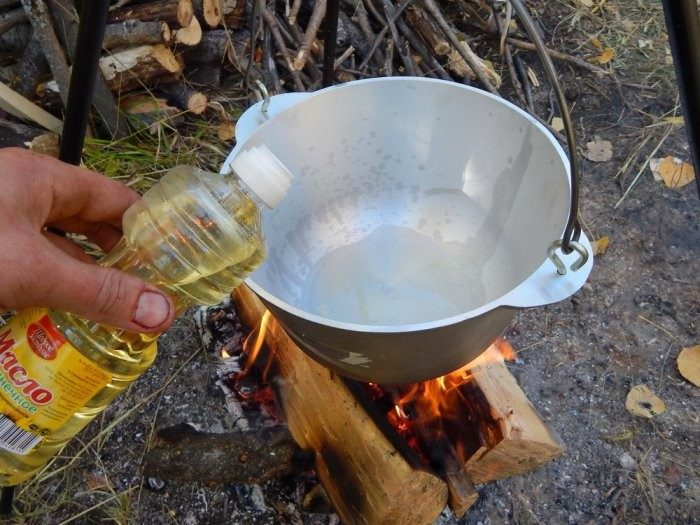 Ставим казан на огонь, даем ему нагреться до высокой температуры. Этим временем потрошенную и опаленную утку рубим на порционные крупные куски. Желательно было бы взять две утки, увы, за утрянку добыли одну. Если есть время – промыть мясо и дать ему обсохнуть. В казан выливаем растительное масло. Ждем, когда оно раскалиться и начнет трещать.
