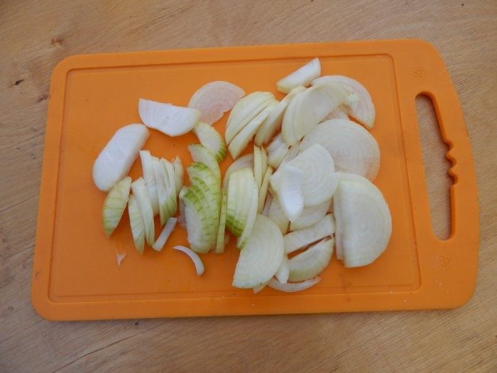 Режем мелко несколько зубчиков чеснока в казан, остальные нам еще пригодятся.