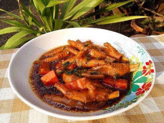 Сначала куриные лапки хорошо промойте и просушите, удалите когти, снимите лишнюю кожицу.В кастрюлю налейте воду, погрузите в неё лапки и поставьте их на огонь. Варить такой продукт следует в течение двадцати-тридцати минут. Воду можно немного посолить, но не сильно.Выньте лапки и сложите в дуршлаг, чтобы лишний бульон стёк.В сковороду налейте масло, нагрейте его. Обжаривайте лапки до золотистости. И будьте готовы к тому, что они будут «стрелять», так что лучше отойти от плиты подальше.Когда лапки подрумянятся, в сковороду можно вливать соевый соус и уксус. Сразу же добавьте очищенный и пропущенный через пресс чеснок, сахар, натёртый на тёрке имбирь и бадьян. Соль не добавляется, так как солёность присуща соусу.Лапки нужно немного потушить под крышкой, чтобы они размягчились ещё больше. Затем прожарьте их для выпаривания лишней жидкости и карамелизации.Интересный факт: такое блюдо нередко называют «Феникс в тигровой шкуре», и поверхность лапок действительно напоминает шкуру этого животного за счёт текстуры и потемнения под воздействием сахара и соуса.