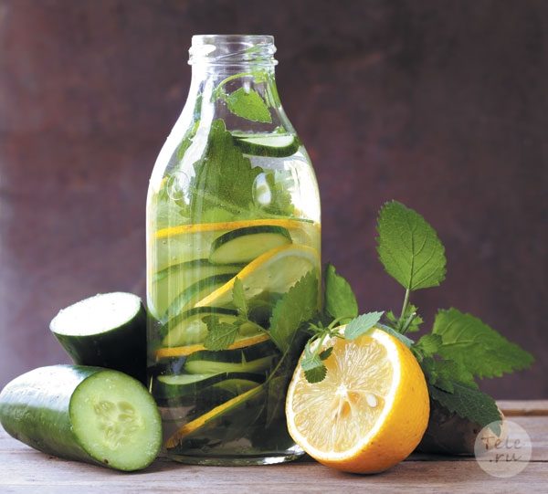 Ингредиенты: лимоны — 1 шт., огурцы — 1 шт., имбирь тертый — 1 ч. л., мята — 12 листиков, мед