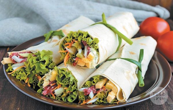 Ингредиенты: листья салатные — 6 шт., колбаса сырокопченая — 200 г, сыр твердый — 100 г, огурцы — 1 шт., лаваш тонкий — 1 шт., сметана — 50 мл, чеснок — 2 зубчика, кинза — 0,25 пучка