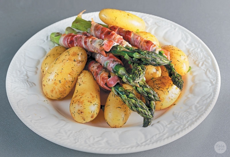 Спаржу вымыть, аккуратно очистить, отрезать твердые нижние концы. Разложить на столе бекон. Выложить на него 3 веточки спаржи, закатать в рулетик и обжарить на растительном масле с трех сторон. Укроп вымыть, обсушить и мелко нарезать. Сделать соус: майонез смешать с лимонным соком. Подавать к столу с соусом и молодым вареным картофелем, посыпанным укропом.