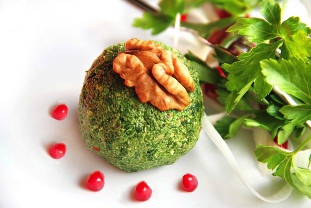 Смешиваем шпинат с ореховой заправкой. Добавляем немного винного уксуса. Получившуюся массу выкладываем в виде шариков, посыпаем гранатовыми зернами и слегка сбрызгиваем маслом грецкого ореха.