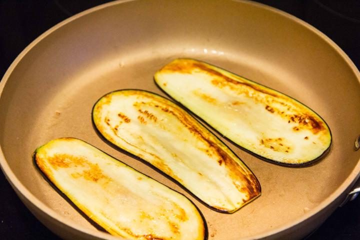 Сковороду протереть растительным маслом и обжарить баклажаны с двух сторон. Когда они будут готовы, лучше всего оставить заготовки на горячей сковородке, чтобы они немного размягчились.