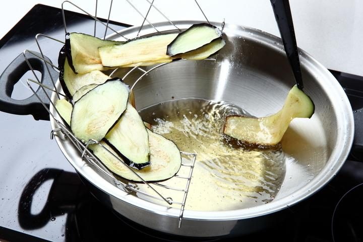 Разогреть в cковороде растительное масло. Обжарить в нем ломтики баклажанов до румяной корочки, откинуть их на решетку, чтобы стекло лишнее масло, и выложить на бумажную салфетку для просушивания.