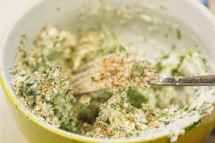 Приготовить начинку. В емкость для смешивания выложить тертый сыр и творог. Добавить к ним мелко порубленные чеснок, зелень кинзы и грецкие орехи. Все перемешать, добавить соль, перец и сладкую паприку.