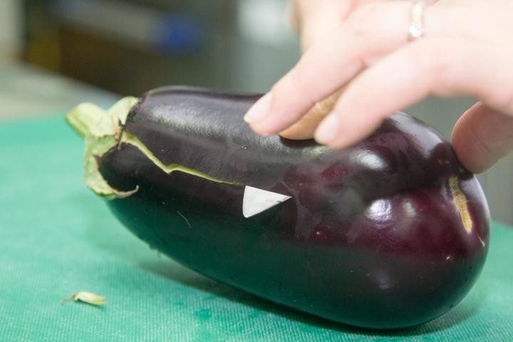 Баклажан вымыть, сделать надрез со стороны плодоножки и срезать верхний тонкий пласт.