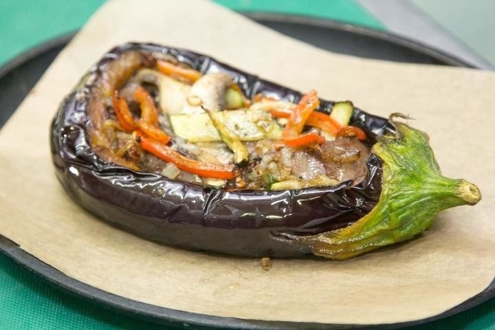 Нафаршировать овощной смесью баклажан.