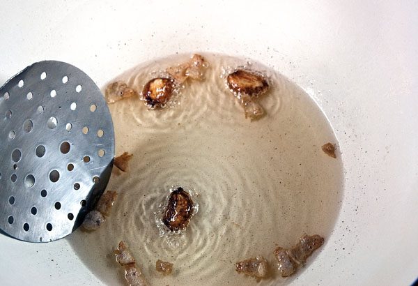 Баклажаны известны своей невероятной способностью впитывать масло, поэтому для даже такого относительно небольшого количества овощей масла должно быть достаточно. В глубокой сковороде, а лучше в воке или в казане разогреваем 150-200 граммов растительного масла и ароматизируем его примерно 100 граммами свиного или бараньего сала и прибереженными 3-4 зубцами чеснока, предварительно раздавленных плоской стороной лезвия ножа.
