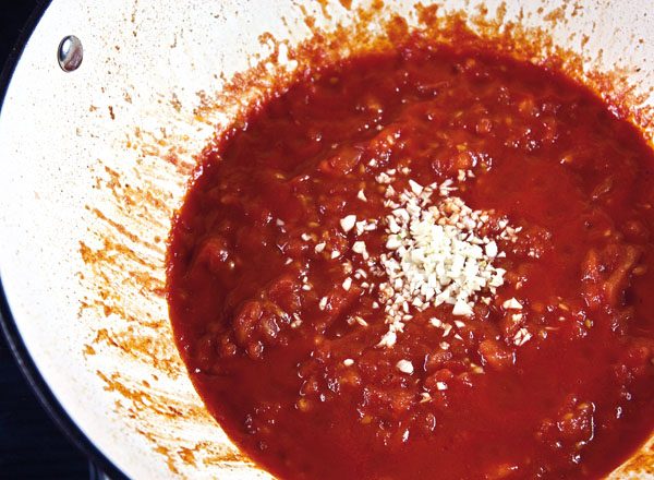 Наконец, в жалких остатках масла, в которых остался и вкус овощей, и вкус сала, готовим, собственно, помидоры, а точнее — соус, которым напитается основное блюдо, добавив в помидоры остатки рубленного чеснока (нужно сохранить примерно столовую ложку).