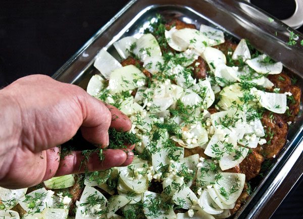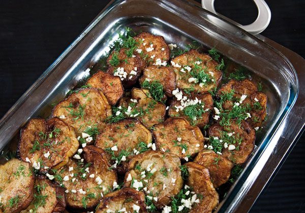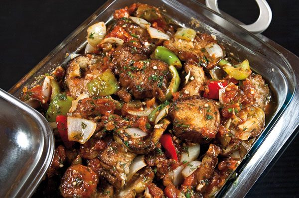 Это блюдо, слои которого хорошо и уверенно пропитываются маслом, соками полусырых овощей и совершенно «сырых» рубленого чеснока и зелени лучше всего подавать теплым, каковым оно, собственно, остается долго время. Важно перед подачей все овощи аккуратно перемешать. Хотя для любителей «горячего» ничто не мешает подогреть готовое блюдо в духовке. Главное — не обжаривать овощи «общей кучей» — получите баклажанную икру, не более.