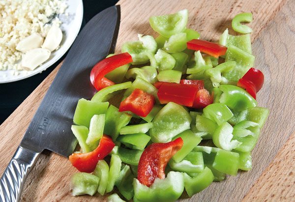 В катастрофически уменьшающемся масле столь же быстро, как и лук, обжариваем болгарский перец, чтобы и он был полусырым и хрустящим. И — выкладываем его на лук, чуть посолив и поперчив и добавив порцию рубленого чеснока и зелени, прикрыв потом крышкой или фольгой.