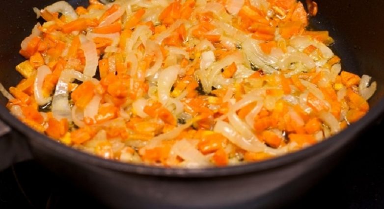Обжарь лук с морковью на сковороде.