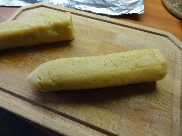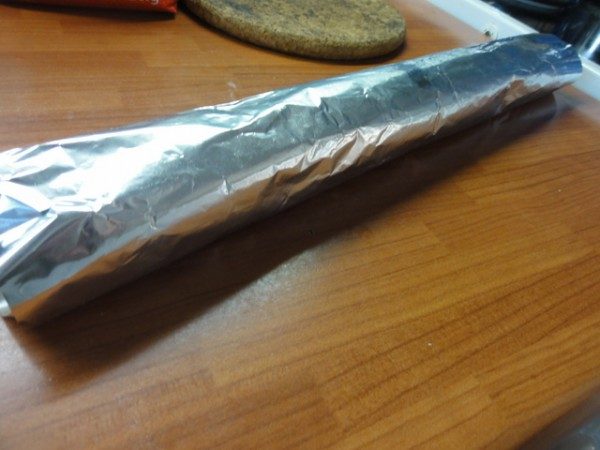 Переложите тесто (теплое ещё) колбаской на фольгу.