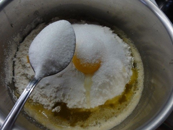 Два стакана муки высыпайте прямо в ковшик с маслом, снятый с плиты. Ничего что оно горячее, не бойтесь.