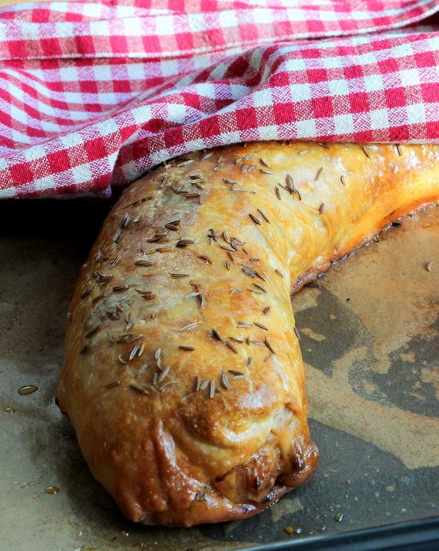 Духовку включила на 180 градусов, противень застелила пекарской бумагой. Теперь опять же с помощью полотенца надо рулет перенести на бумагу и выложить швом вниз. Можно по диагонали, а можно немного согнуть подковой. Сверху рулет помазала взболтанным яйцом и посыпала семенами тмина (очень уважаю тмин к капусте):
