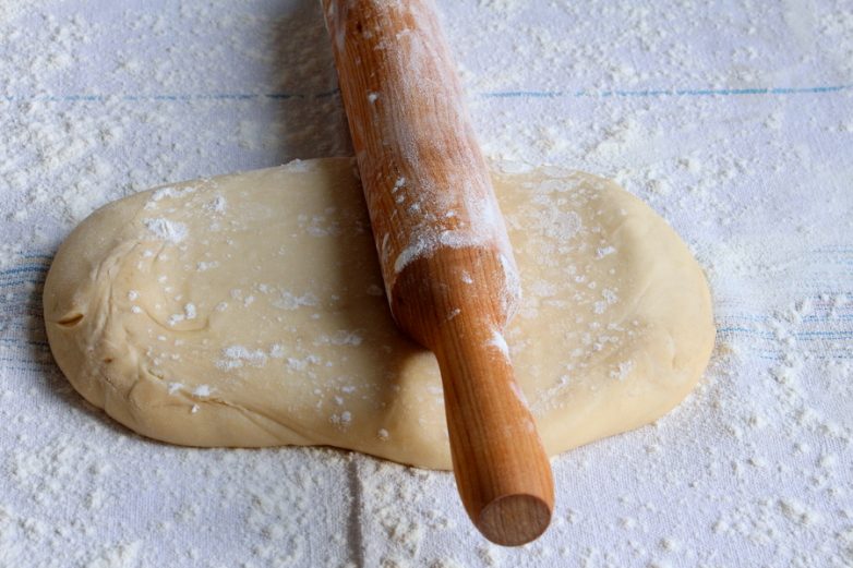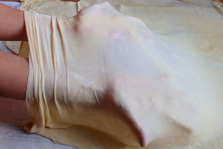 Когда растянули на всю площадь полотенца (это у меня где-то 90 на 60 см), и сквозь тесто стал проглядывать рисунок ткани — харэ. А так-то можно и дальше, оно до бесконечности может вытянуться, ну, просто уже неудобно будет работать с начинкой, получатся разрывы.