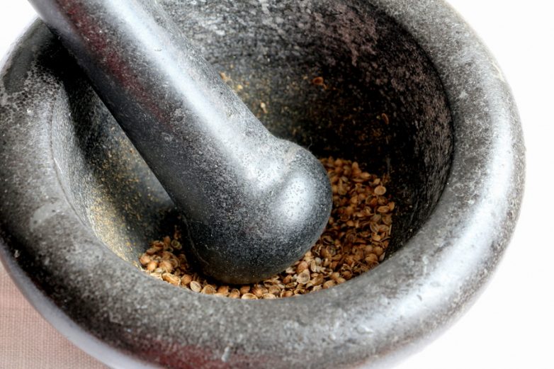 Для начала обжарила лук на растительном масле до золотистости, затем добавила к нему капусту. И долго её обжаривала, помешивая. В середине процесса посолила-поперчила и добавила смолотый кориандр и укропные семена: