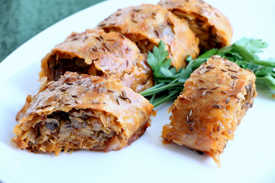 Подавать можно с соусом из сметаны и зелени, а можно и безо всего, штрудель получился довольно сочным. И вкусным! Всем приятного аппетита, и помните, капусточка, конечно, дело хорошее, но в доме надо держать и мясные закуски)))