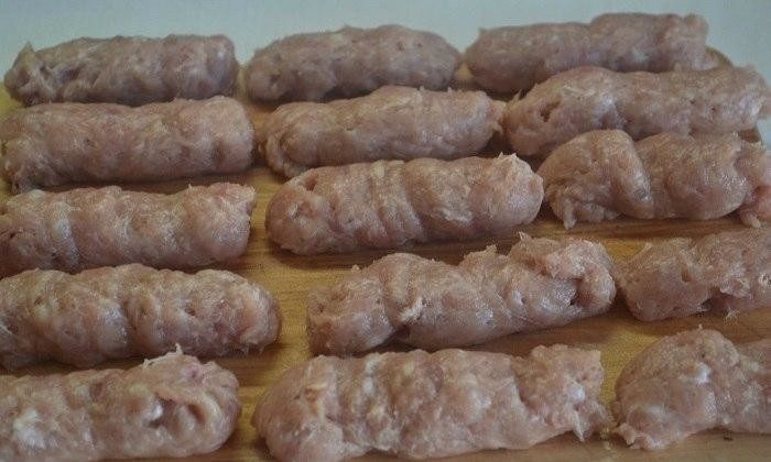 Таким образом сформировать все колбаски и выложить их на доску, смоченную водой (к сухой поверхности они могут прилипнуть).