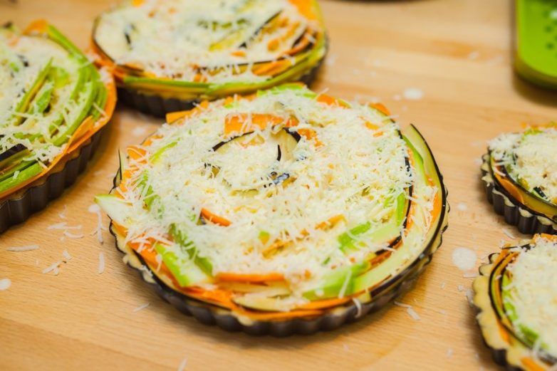 Чередуя, выложить по кругу формы полоски овощей, начиная от края и двигаясь к центру.