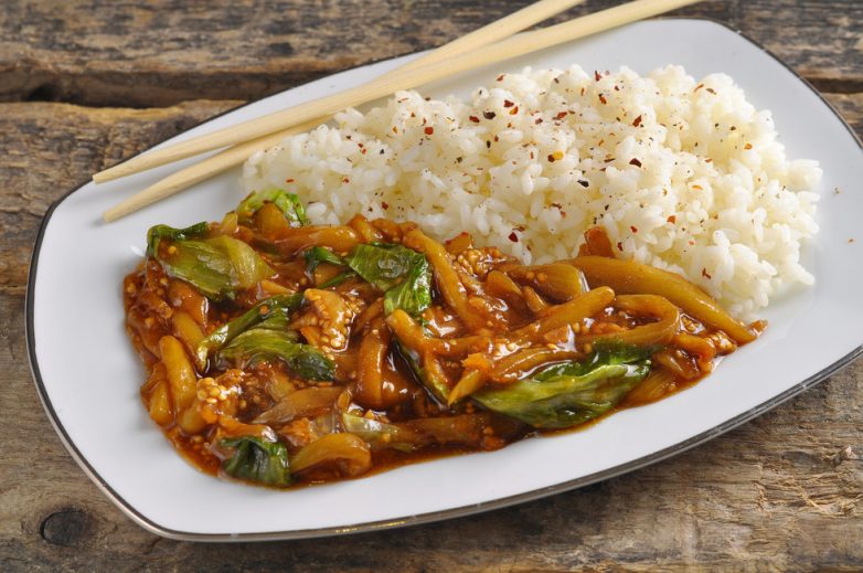 Баклажаны помыть, обсушить (по желанию можно почистить), нарезать брусочками толщиной в 1 см. В миске смешать воду, соевый соус, соус чили, натёртый имбирь, кунжутное масло, рисовый уксус и крахмал. В воке нагреть растительное масло, обжарить нарубленный чеснок 10 секунд, до появления аромата, добавить нарезанные баклажаны и жарить, постоянно помешивая, минут пять. Влить смесь соусов с крахмалом, перемешать, готовить до загустения соуса. Добавить нарезанный шпинат, перемешать и снять с огня. Подавать баклажановый стир-фрай с отварным рисом.
