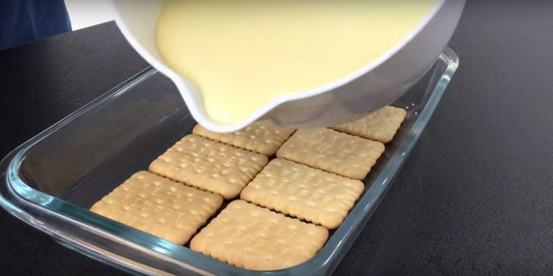Пришло время складывать торт. Для этого подготовь специальную форму и застели ее кулинарной бумагой. Выложи первый слой из печенья, затем смажь его кремом. Выложи второй слой из печенья и крема. Повторяй манипуляцию до тех пор, пока не закончится печенье.