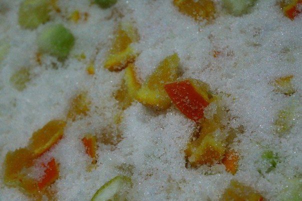 3. Засыпаем сахаром и оставляем минимум на 5 часов или на ночь, что бы кабачки и цитрусы пустили сок.