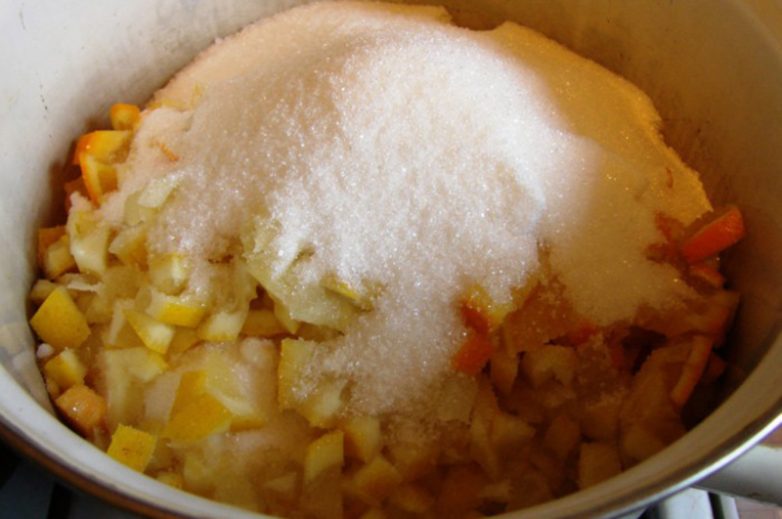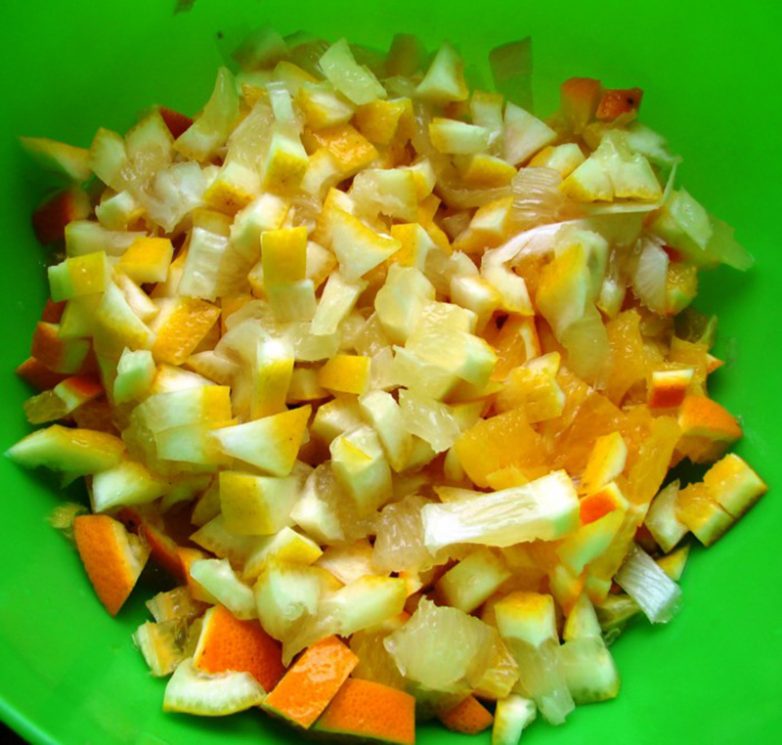 Переходи к подготовке цитрусовых.Вымой апельсины и лимон и также нарежь их кубиками. Для облегчения труда можно пропустить цитрусовые через мясорубку.
