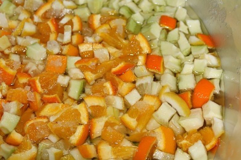 В большой миске смешай кабачки и цитрусовые и засыпь их сахаром. Оставь настояться на 5 часов, а лучше на всю ночь. Так ингредиенты станут слаще и пустят сок.