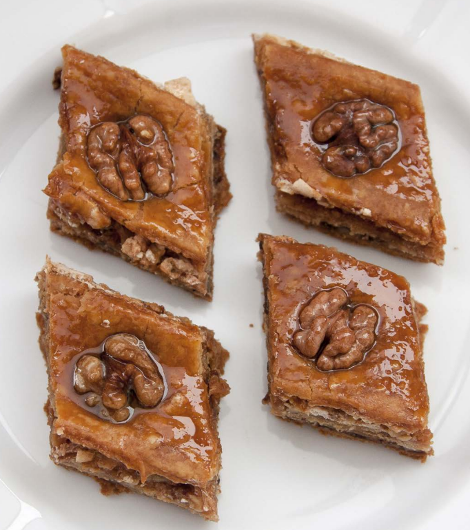10. Готовую пахлаву вынуть из духовки. Мед разогреть, не доводя до кипения, и залить им пахлаву.