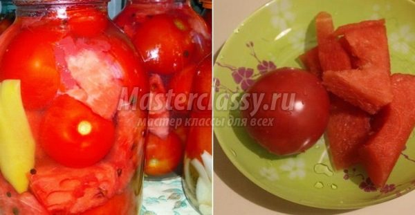 Помидоры с арбузом. Даже не пробовала. Наверно такой своеобразный вкус получается.