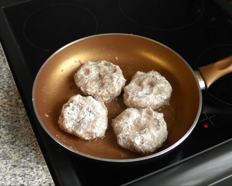 Из фарша формируем небольшие котлеты и обваливаем немного в муке, чтобы они не разваливались и получилась поджаристая корочка. Выкладываем котлеты порциями на хорошо разогретую сковороду, в которую наливаем растительное масло. Нам нужно обжарить котлеты по 3 минуты с каждой стороны, чтобы получить приятную золотистую корочку.