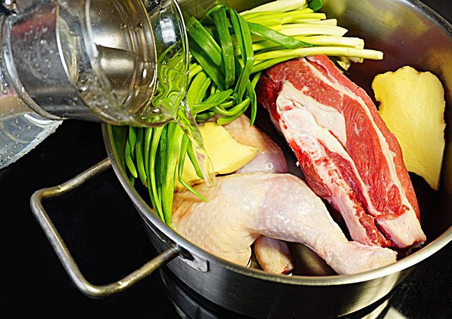 Складываю мясо, курицу, лук и имбирь в подхлдящую кастрюлю и заливаю примерно тремя литрами холодной воды.