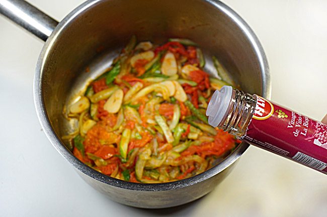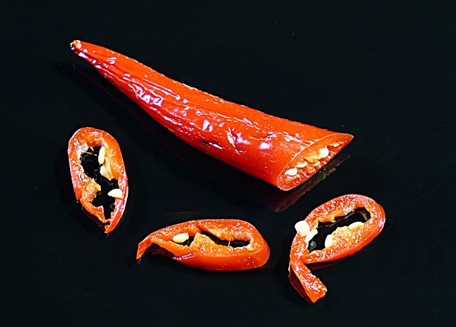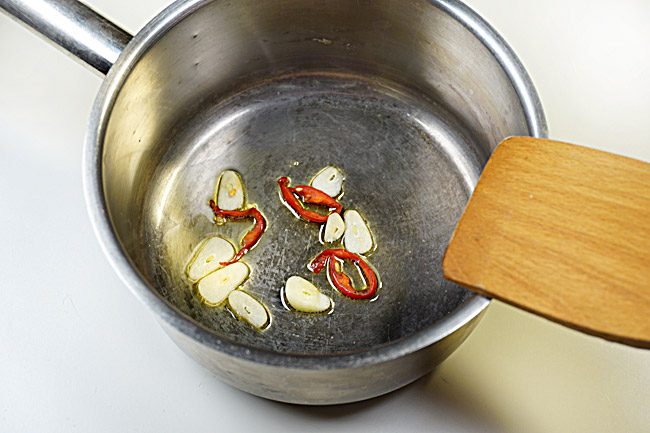 В умеренно разогретом растительном масле слегка обжарим чеснок и перец, добавив, таким образом, к нейтральному по вкусу маслу более яркие оттенки.
