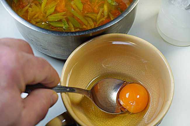 Из вбитого в плошку яйца удалим желток, потому что для супа нам понадобится только белок.