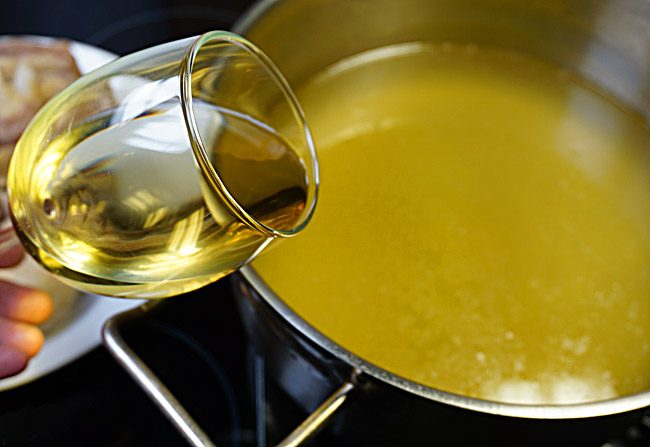… вливаю в него бокал сухого белого вина, довожу до кипения и оставляю охлаждаться. Подобные бульоны я никогда не солю — а нафига, если они применяются как основа для тех или иных супов, включая, кстати, рыбные, или чтобы отварить домашние пельмени? Посолить по вкусу никогда не поздно.
