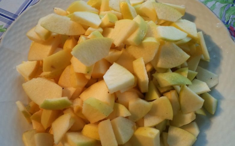Очисти яблоки от кожуры и сердцевины, затем нарежь на небольшие дольки.
